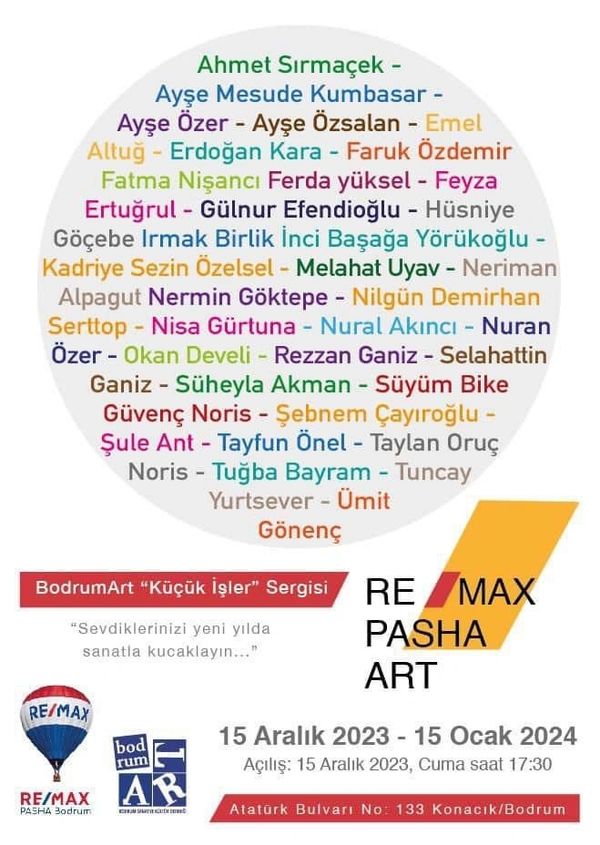 “Yeni yılda sevdiklerinizi sanatla kucaklayın.” mottosuyla ve tek ebat, tek fiyat konseptiyle oluşturduğumuz sergi 15 Ocak 2024 tarihine kadar Re/max Pasha Bodrum galerisinde gezilebilir.