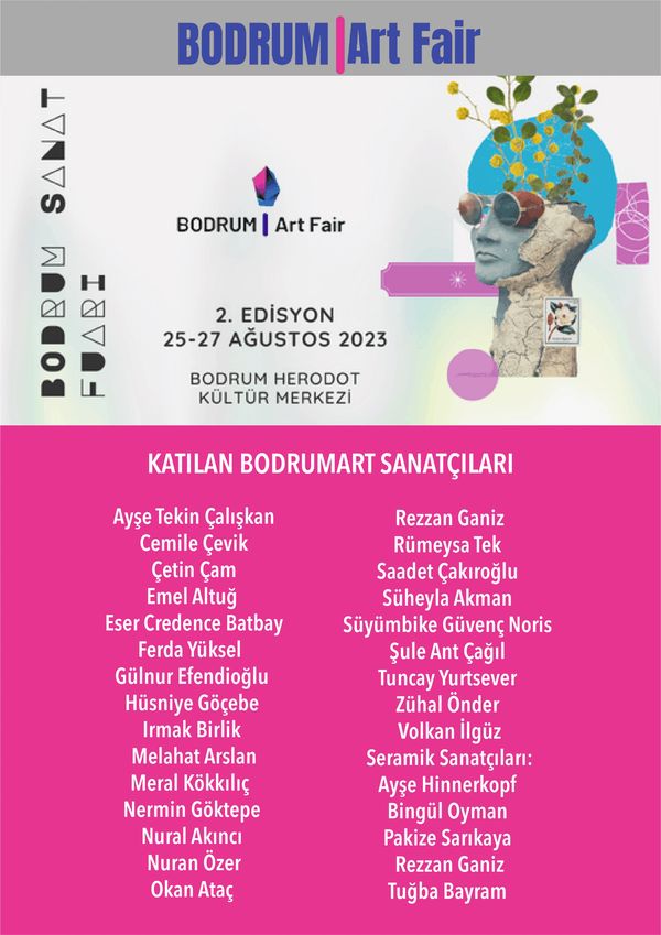25-27 AĞUSTOS TARİHLERİ ARASINDA HERODOT KÜLTÜR MERKEZİ’NDE GERÇEKLEŞECEK OLAN BODRUM SANAT FUARINA KATILACAK OLAN DERNEK SANATÇILARIMIZIN LİSTESİNE BURADAN ULAŞABİLİRSİNİZ.